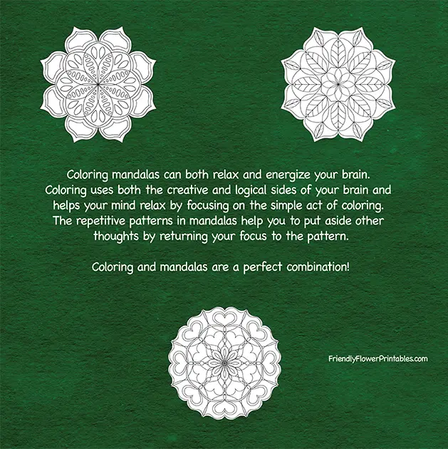 • Mediation - The repetitive patterns in mandalas help you to put aside other thoughts by returning your focus to coloring.